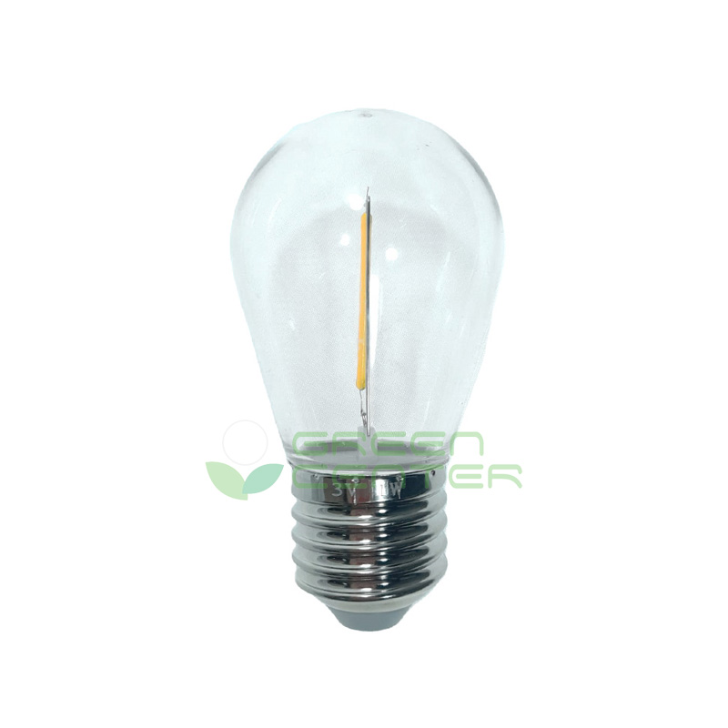 Ampolleta LED transparente de 12V con rosca E27, diseñada para guirnaldas solares. Resistente a golpes y para uso exterior.