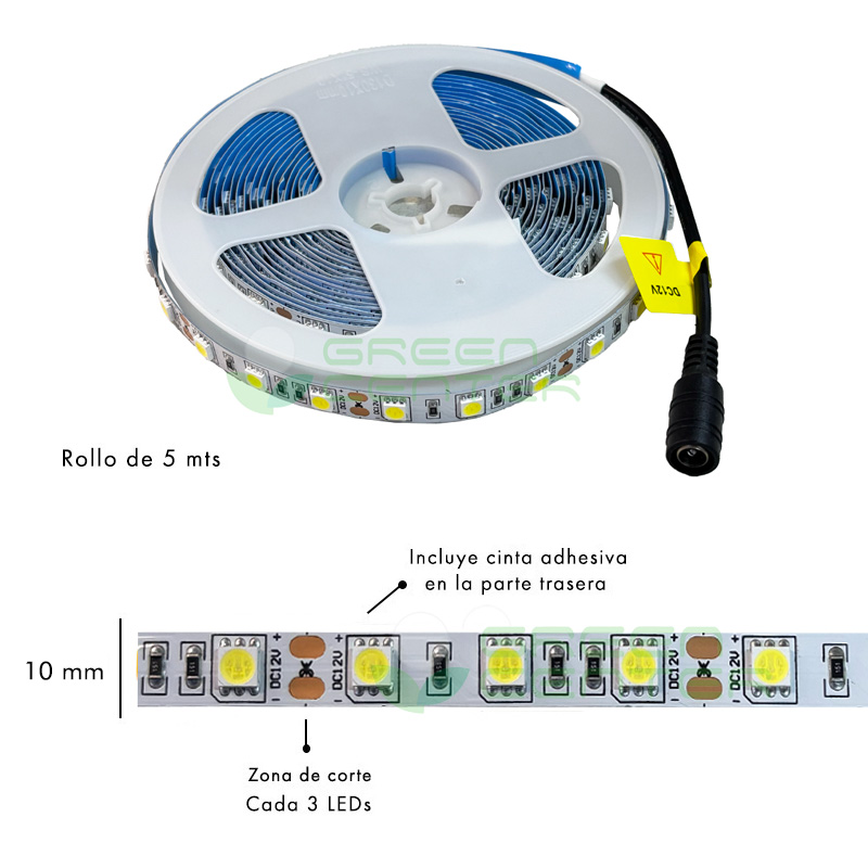 Cinta LED 5050 de 12V, ideal para iluminar espacios interiores con una luz neutra y gracias a sus chips LED de alto lumen y su diseño compacto, es perfecta para crear ambientes acogedores en salas, dormitorios, estanterías, vitrinas y más. Cuenta con 60 LEDs por metro, lo que garantiza una iluminación uniforme y brillante. Además, su diseño flexible y autoadhesivo facilita una instalación rápida en cualquier superficie interior.