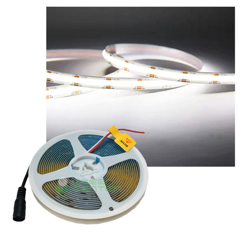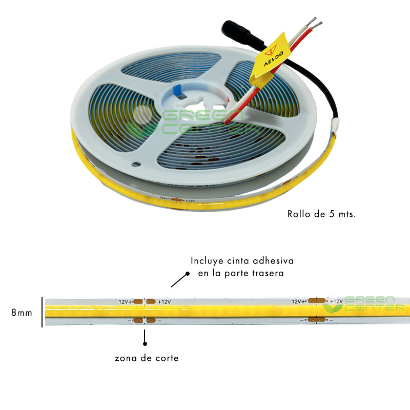 Cinta LED COB de 12V, ideal para decoración en interiores, su diseño avanzado proporciona una línea de luz uniforme que realza muebles, techos, vitrinas o cualquier ambiente moderno. Con un flujo luminoso de 110 lm/W y cortes cada 5 cm, esta cinta ofrece una iluminación continua y de alta calidad para cualquier tipo de instalación personalizada.