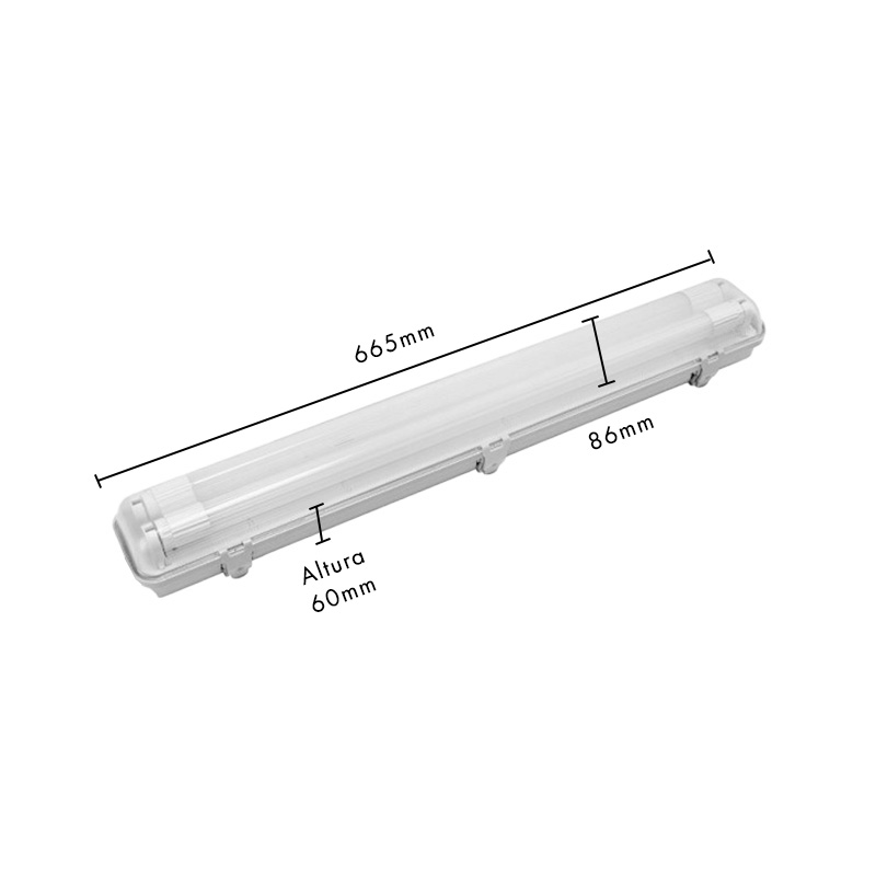 Equipo estanco hermético diseñado para la conexión y montaje de 2 tubos LED de 60 cms (incluidos). Ideal para ambientes exteriores o con alta humedad como aleros, escaleras y estacionamientos, garantizando protección contra polvo y agua.