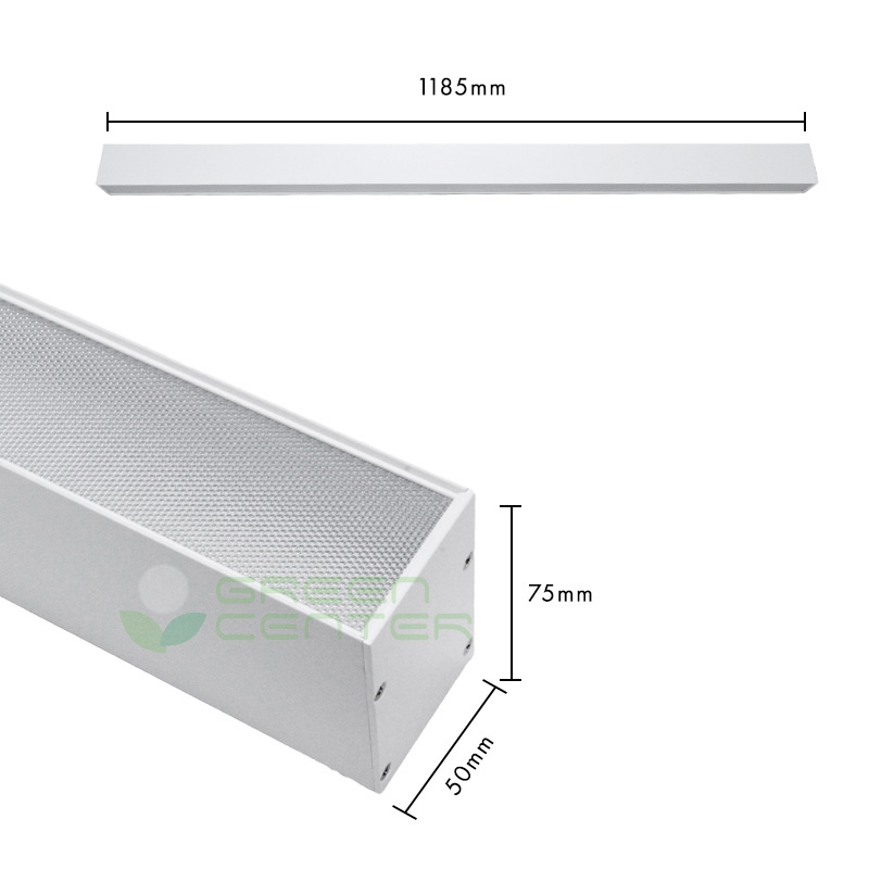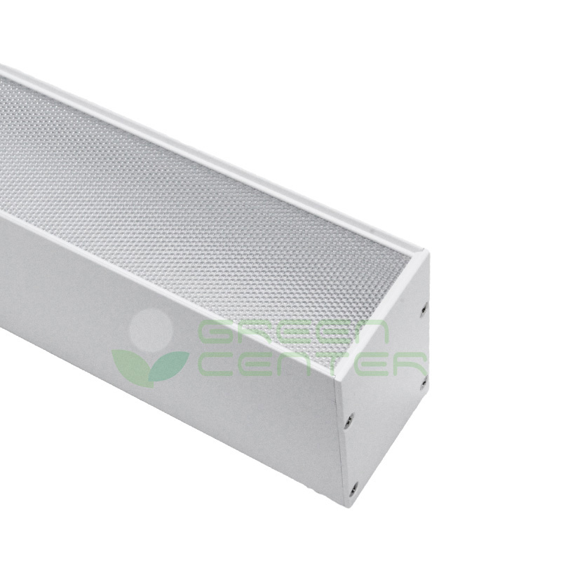 Luminaria lineal colgante LED en color blanco con tecnología antideslumbrante UGR, que ofrece una iluminación eficiente y confortable para espacios interiores. Su diseño moderno y elegante se complementa con un sistema de piolas para una instalación rápida y ordenada. Ideal para oficinas, locales comerciales y ambientes donde se busca minimizar el deslumbramiento.