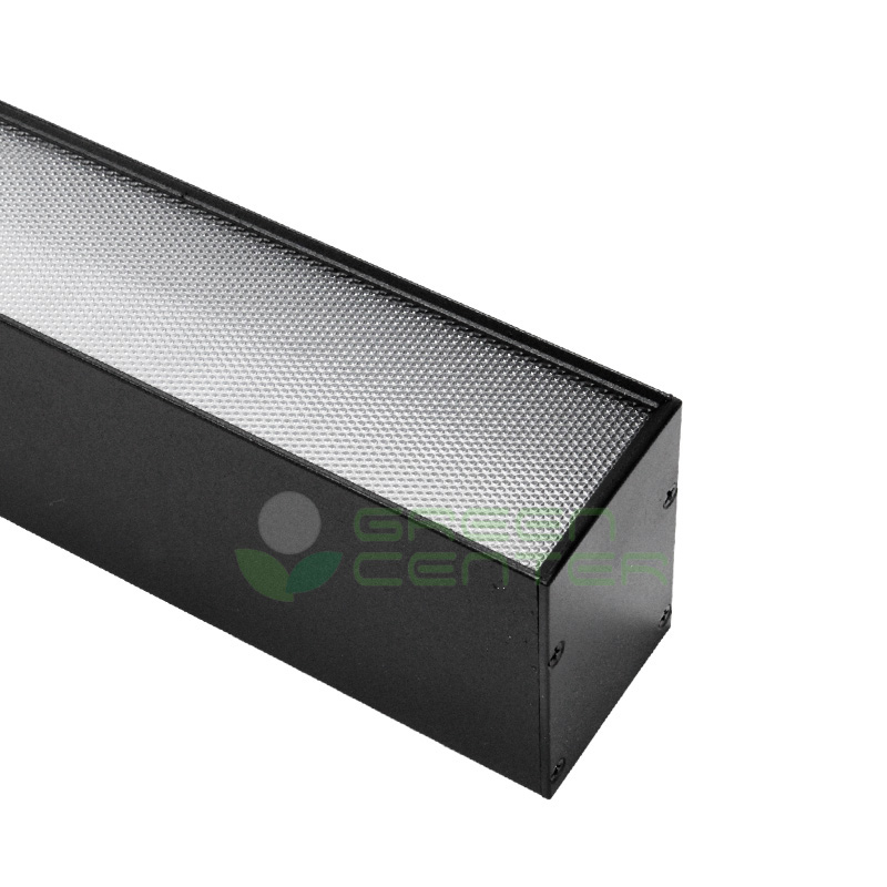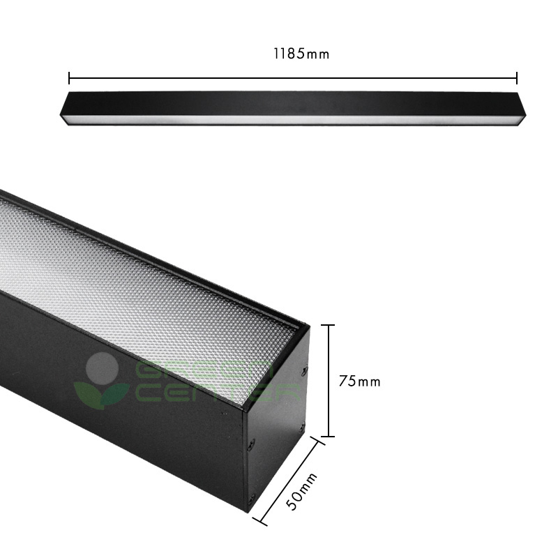 Luminaria lineal colgante LED en color negro con tecnología antideslumbrante UGR, que ofrece una iluminación eficiente y confortable para espacios interiores. Su diseño moderno y elegante se complementa con un sistema de piolas para una instalación rápida y ordenada. Ideal para oficinas, locales comerciales y ambientes donde se busca minimizar el deslumbramiento.