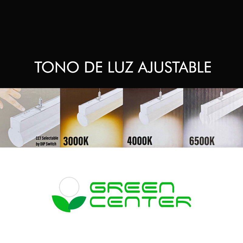 Luminaria LED lineal colgante de 1.2 metros con sistema CCT ajustable, que permite configurar el tono de luz en cálido (3000K), neutro (4000K) o frío (6500K). Diseñada para oficinas, locales comerciales y salas de reunión, ofrece iluminación uniforme con bajo consumo energético. Su acabado en color blanco y sistema de suspensión con piolas garantizan una instalación sencilla y una estética moderna.