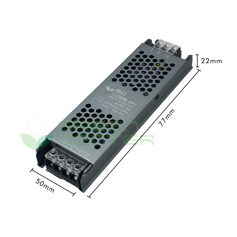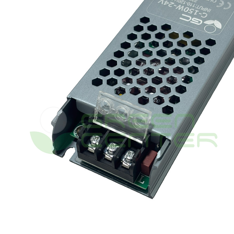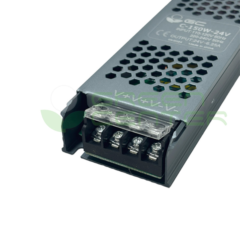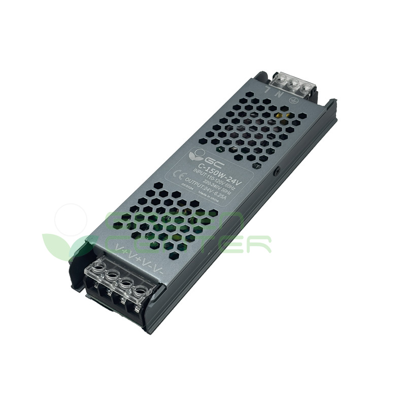 Fuente de poder LED con salida DC24V y potencia máxima de 150W, ideal para alimentar luminarias LED de alto consumo que operan con 24V. Cuenta con un diseño compacto y ultradelgado y una carcasa metálica que permite una instalación sencilla en gabinetes, muebles o espacios de montaje reducidos. Ideal para aplicaciones discretas y de bajo consumo.