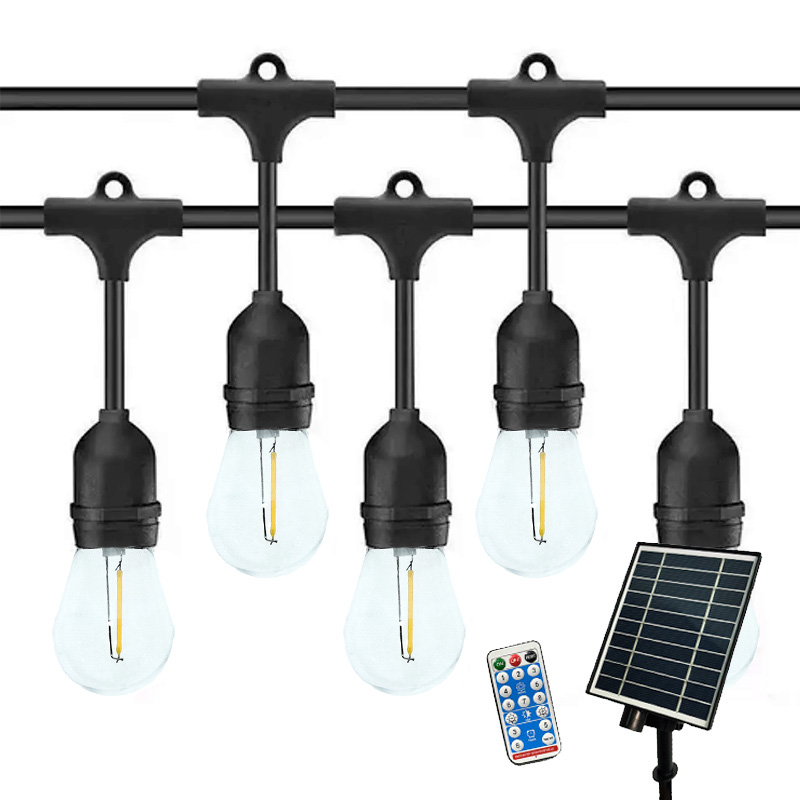 Añade un toque único y cálido a tus celebraciones con esta guirnalda solar LED de 10 metros con 10 soquetes para ampolletas LED con rosca E27. Perfecta para decorar patios, restaurantes, locales comerciales o eventos, su diseño vintage ilumina con estilo y crea un ambiente acogedor. Incluye control remoto, estaca y panel solar, el cual permite recargar con energía solar y eléctrica en caso de días nublados. Con protección IP65, es ideal para uso en exteriores, resistiendo condiciones climáticas y garantizando una larga duración.