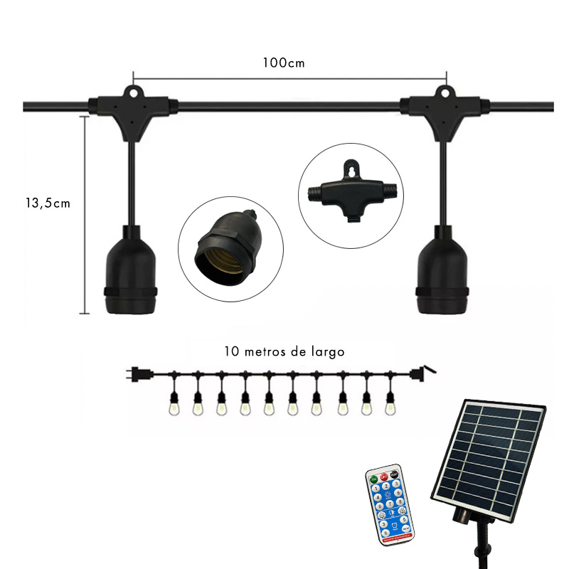 Añade un toque único y cálido a tus celebraciones con esta guirnalda solar LED de 10 metros con 10 soquetes para ampolletas LED con rosca E27. Perfecta para decorar patios, restaurantes, locales comerciales o eventos, su diseño vintage ilumina con estilo y crea un ambiente acogedor. Incluye control remoto, estaca y panel solar, el cual permite recargar con energía solar y eléctrica en caso de días nublados. Con protección IP65, es ideal para uso en exteriores, resistiendo condiciones climáticas y garantizando una larga duración.