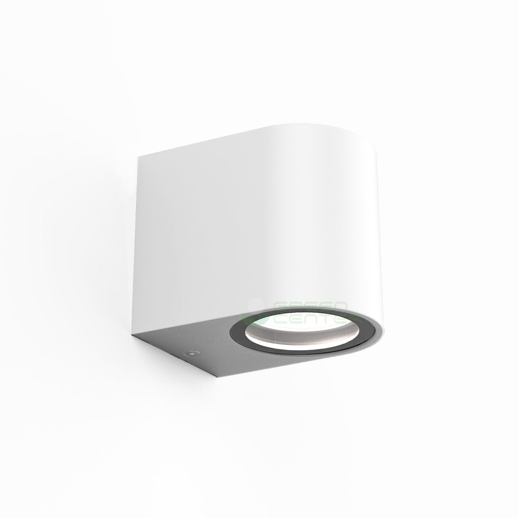 Apliqué de muro unidireccional (iluminación 1 lado) con diseño cilíndrico en color blanco, ideal para iluminación decorativa en muros exteriores. Fabricado para alojar una ampolleta GU10 (no incluida), este soporte cuenta con protección IP44 contra agua y polvo, lo que lo hace apto para exteriores protegidos.
