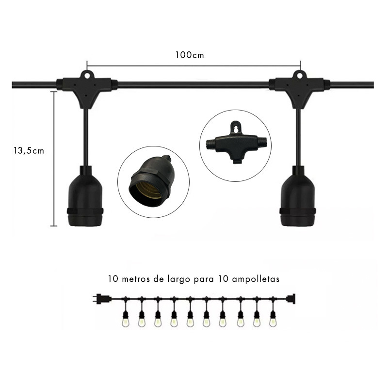 Añade un toque único a tus celebraciones con esta tira marquesina para ampolletas LED vintage. Perfecta para decorar patios, restaurantes, locales comerciales o eventos. Con protección IP65, es ideal para uso en exteriores, resistiendo condiciones climáticas y garantizando una larga duración.
